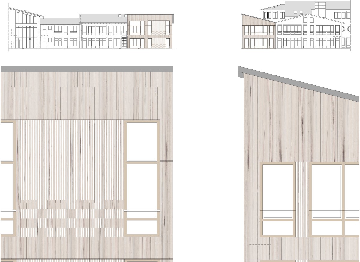 Die neuen Außenwände erhalten eine vertikale Holzverschalung, deren weiß lackierte Leisten die Ornamentik der Rotunde am Schulhof aufgreifen.