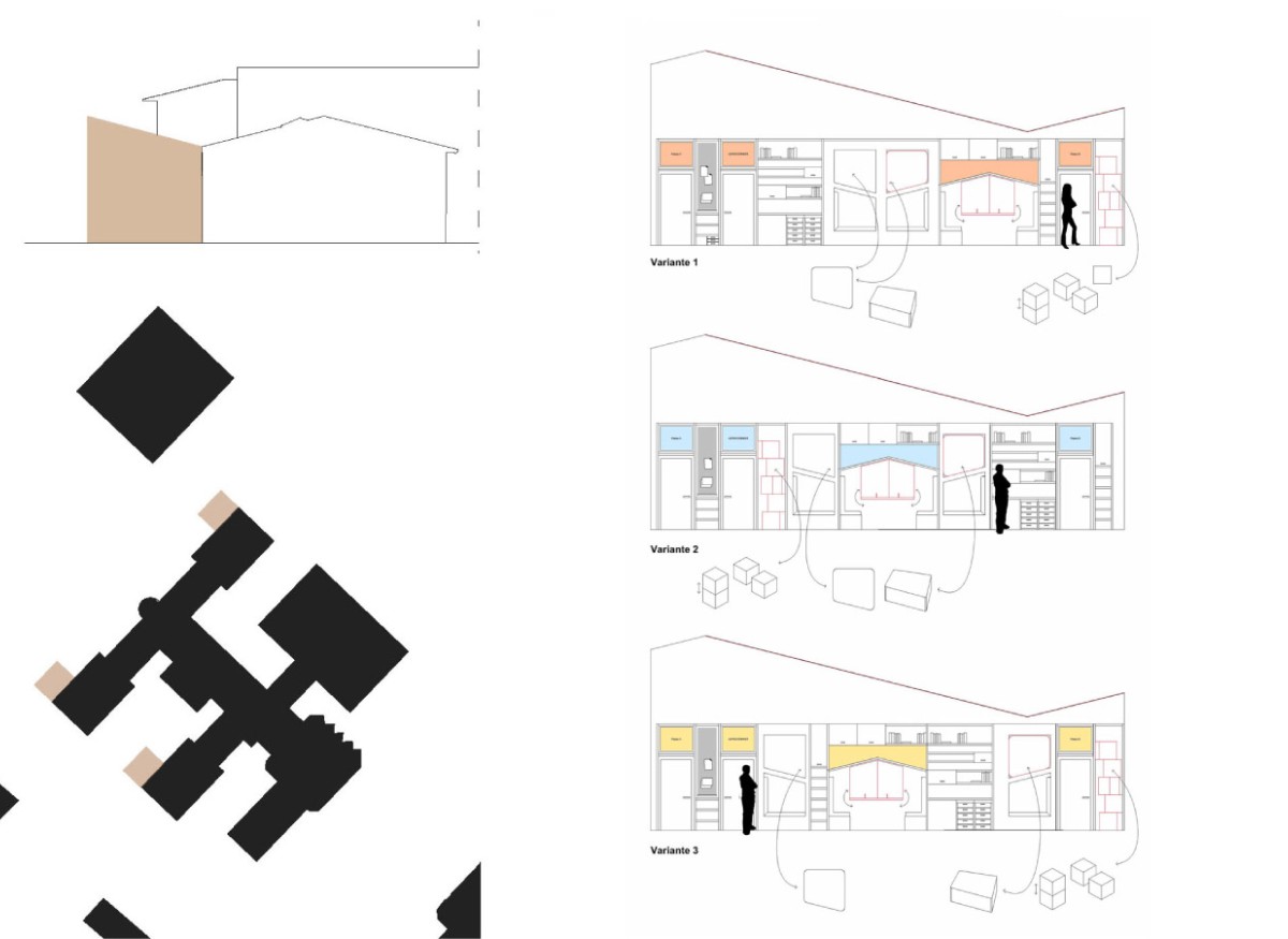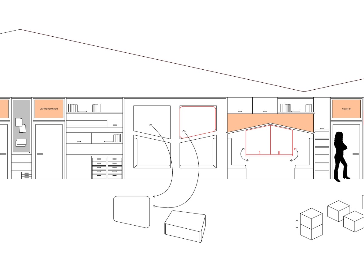 Die Jahrgangsflächen sollen zukünftig multifunktional bespielt werden. Dafür haben wir ein Wandmöbel entworfen, in dem Sitzblöcke, Kissen, Tischplatten, Arbeitsmaterialien etc. Platz finden.