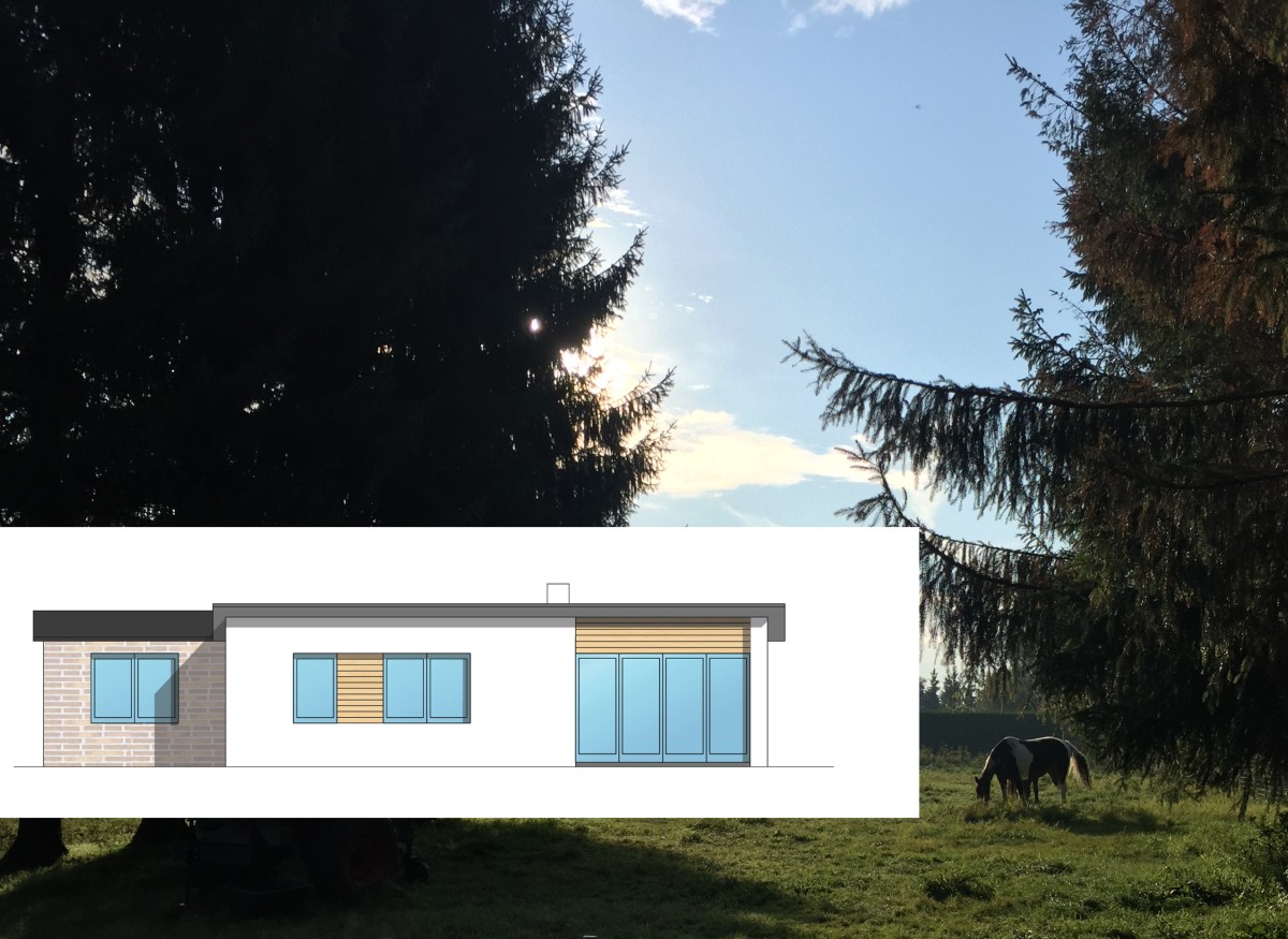 Eine junge Familie wünscht sich ein Haus für jetzt und später, familien- und altengerecht. Mitten im Grünen mit tollen Ausblicken, viel Licht und optimaler Orientierung der Räume Innen wie Außen.
