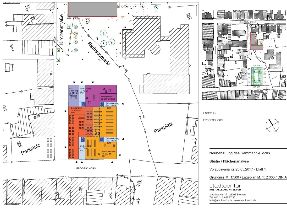 Wir wurden mit einer Studie beauftragt, die in verschiedenen Varianten Nutzungsmixe und ihre Flächenbedarfe auf dem Grundstück analysiert – z. B. einer Kombination von Geschäften, Arztpraxen, Tourismus-Info und Wohnen.